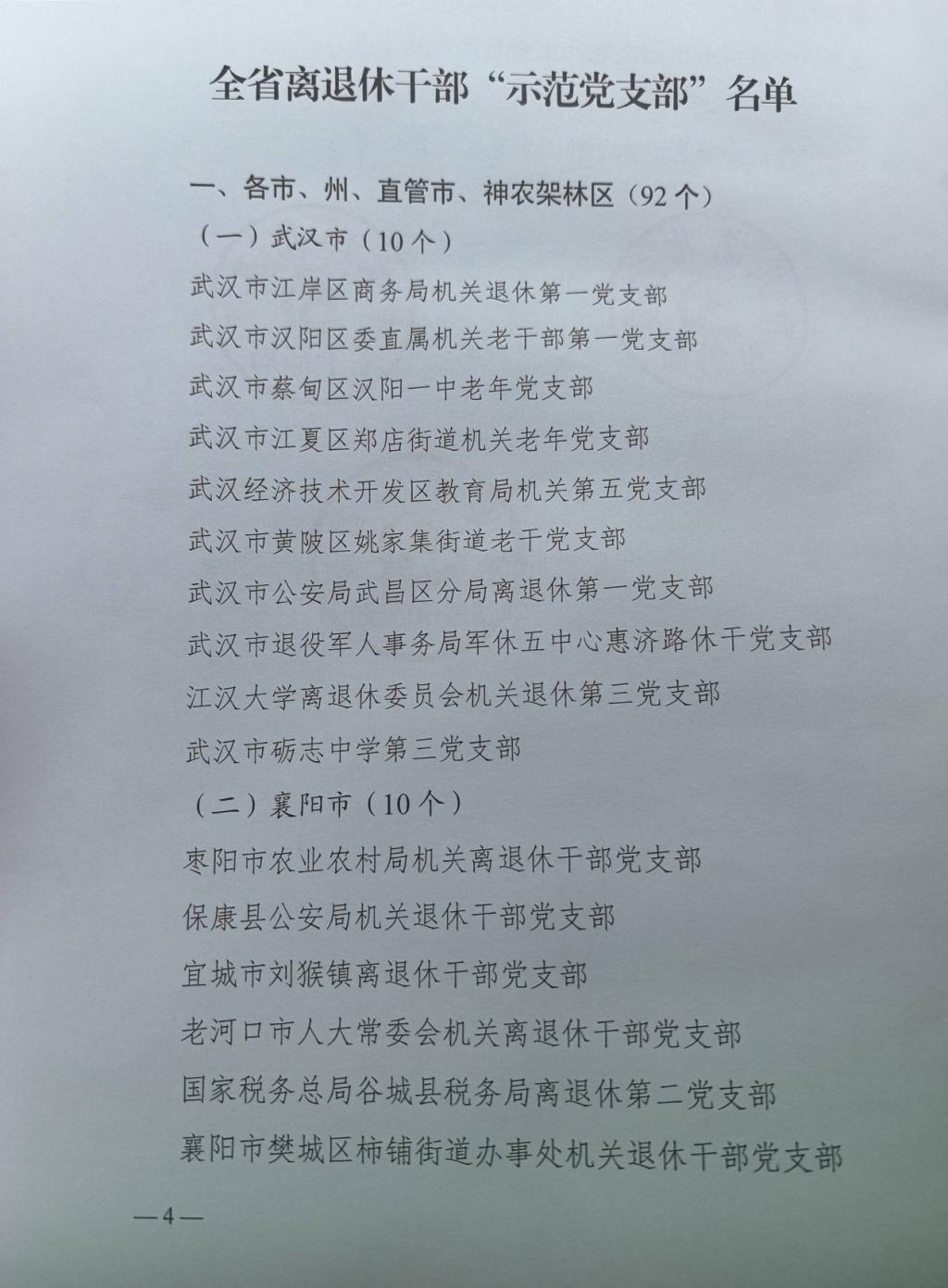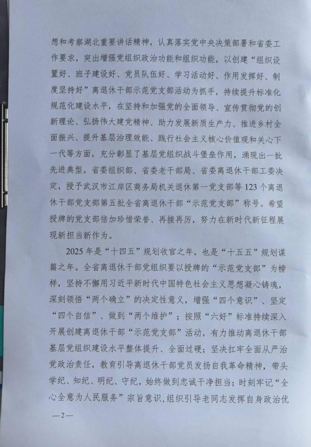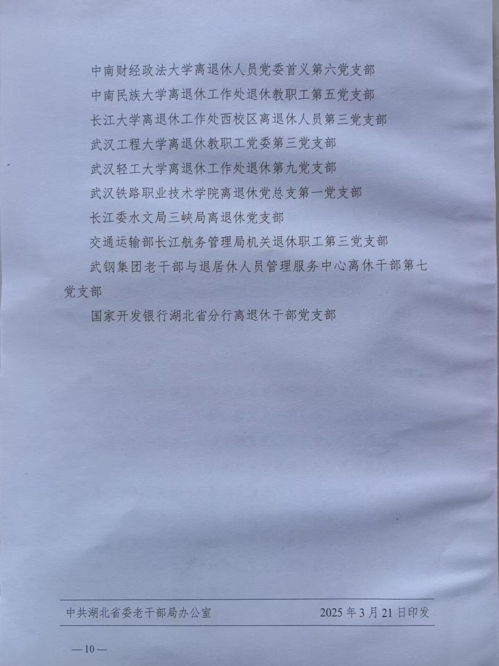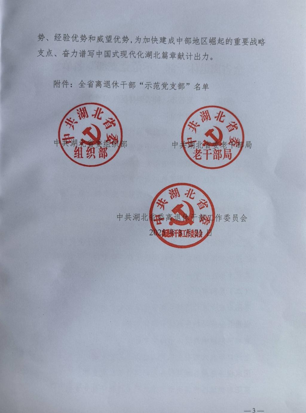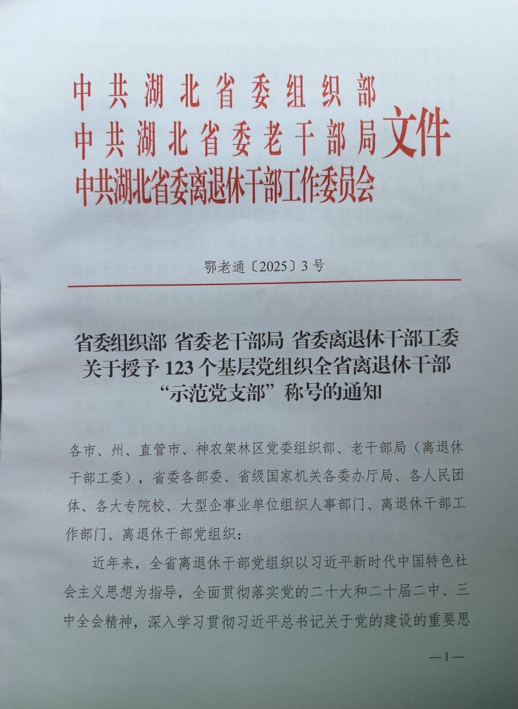 近日,湖北省委组织部、省委老干部局、省委离退休干部工作委员会联合发布表彰决定,我校离退休干部职工第二党支部荣获湖北省离退休干部“示范党支部”荣誉称号。这一荣誉不仅是对该支部党建工作的高度肯定,更是我校党委长期重视离退休党建工作、推动基层党组织高质量发展的生动体现。